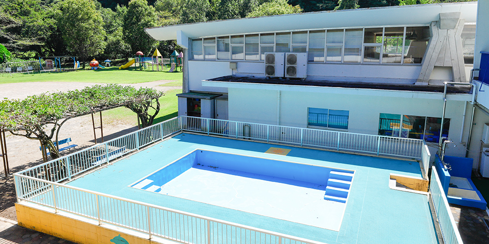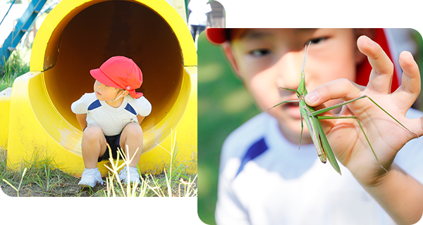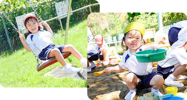 当園は緑に囲まれた自然豊かな環境の中にあり、日本の四季の移り変わりを身近に感じながら過ごしていただけます。岐阜県下最大級を誇る広々とした園庭やプール、砂場などの外遊び設備も充実しているほか、季節ごとに収穫を楽しめる野菜畑もあります。子どもたちは広い園庭で自然に触れ合い、のびのびと元気に体を動かすことができます。