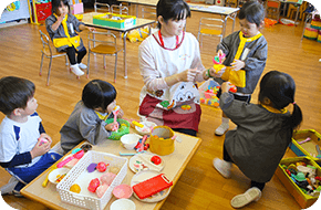 子育てとお仕事の両立を目指して働くママ・パパを応援するべく、子育て支援の立場から、「預かり保育」「満三歳児保育」を実施しています。通常の保育時間の後も、最長18:40までお預かりが可能です。夏休みや冬休みなどの長期休みにも対応しています。