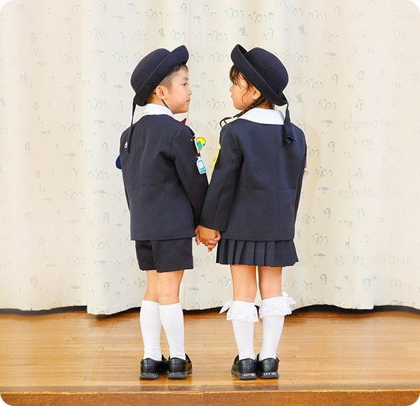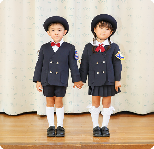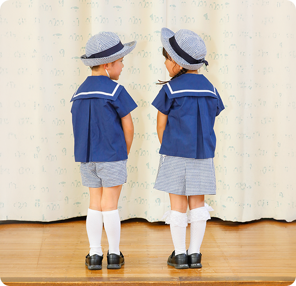 動きやすさとかわいらしさを兼ね備えた自慢の制服です。中でも夏の制服は水兵さんを思わせるスタイルで、元気いっぱいの子どもたちにぴったりのデザインとなっています。