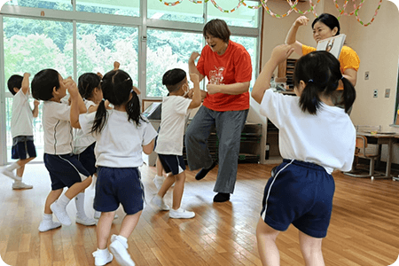 子どもたちの表情や気持ちを細やかに汲み取り、必要に応じて日本語でフォローしながら、一人ひとりのペースで英語の楽しさに触れていきます。歌やゲームを通して、まずは「英語って楽しい!」という気持ちを育むことを何よりも大切にしています。
