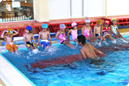 ドルフィンスイミングと連携し、水泳教室を行います。各グループ数名ずつに分かれ、専任コーチの指導を受けながら、水に慣れるところからスタートします。その後、体の動かし方やバタ足など、基礎的なことから学んでいきます。